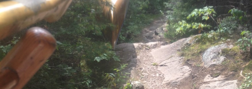 We must have walked a mile or more in portage mode. Passing a few hikers on the way. Some of them did look at us with concern and somewhat confused. But we did not know we were not on the intended trail. After a while I was starting to get suspicious that we may not be going where we thought we were headed? Stacy lowered the canoe, and we left it on the side of the path while we hiked up the trail further.