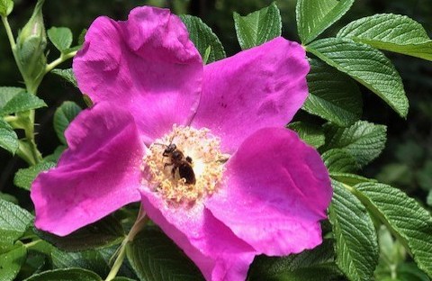 Photo credit – Emy Minzel, Wild rose bush with bee in my back yard